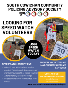 Speed Watch is a community based program to help raise public awareness of speeding in school zones, playgrounds and other problem speeding areas and encourage slowing down for the safety of our community. It is sponsored by the Shawnigan Lake RCMP, ICBC, and SCCPAS.